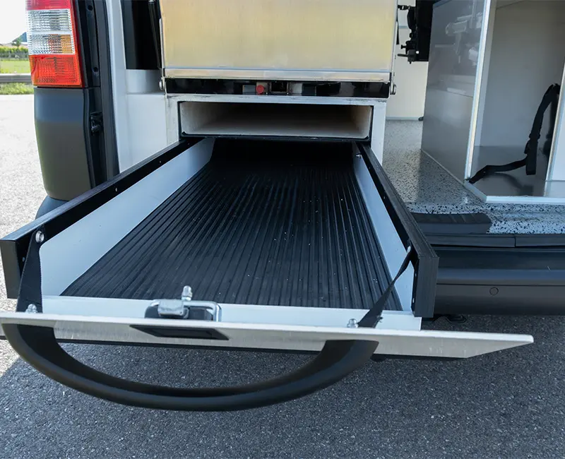 -Fach für Treppenstuhl hinten rechts inkl. Zusatzfach mit Deckel.