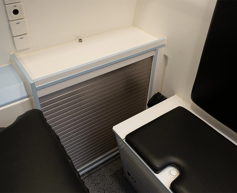 - Tragenlagerung mit universal-Pilzverriegelung, darunter ein Staufach für Schaufeltrage und Rettungsbrett